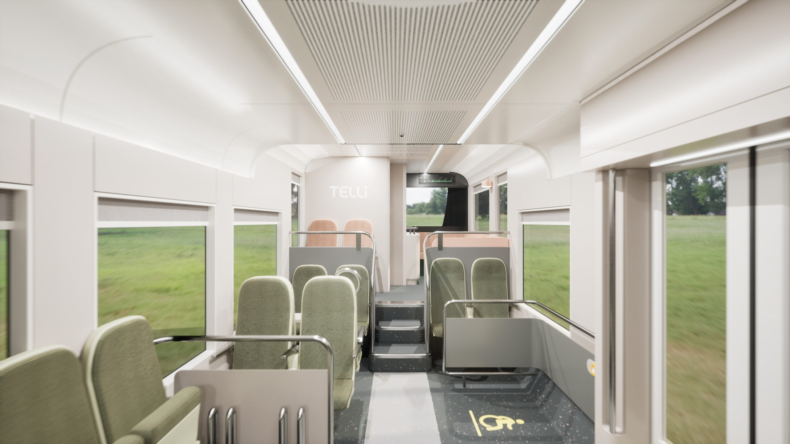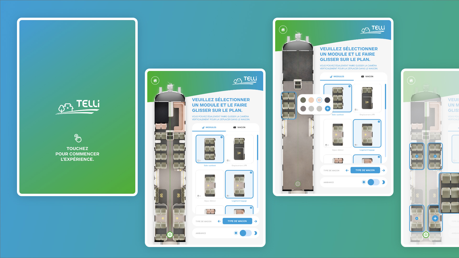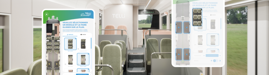 Le showroom TELLi (Train léger innovant) est à destination de l’écosystème de la filière ferroviaire – acteurs publics, entreprises, Autorités Organisatrices de la mobilité, ETI, PME, start-up et associatifs, académiques. Dans la maquette grandeur nature, les matières et les différents aménagements peuvent être modulés à volonté, et les visualiser en rendu immersif permet à tous les visiteurs de mieux se projeter selon leurs besoins. L’interface intuive sur la tablette pour personnaliser la rame du train permet de nourrir les réflexions, faisant de cette animation un élément majeur de la découverte de TELLi.