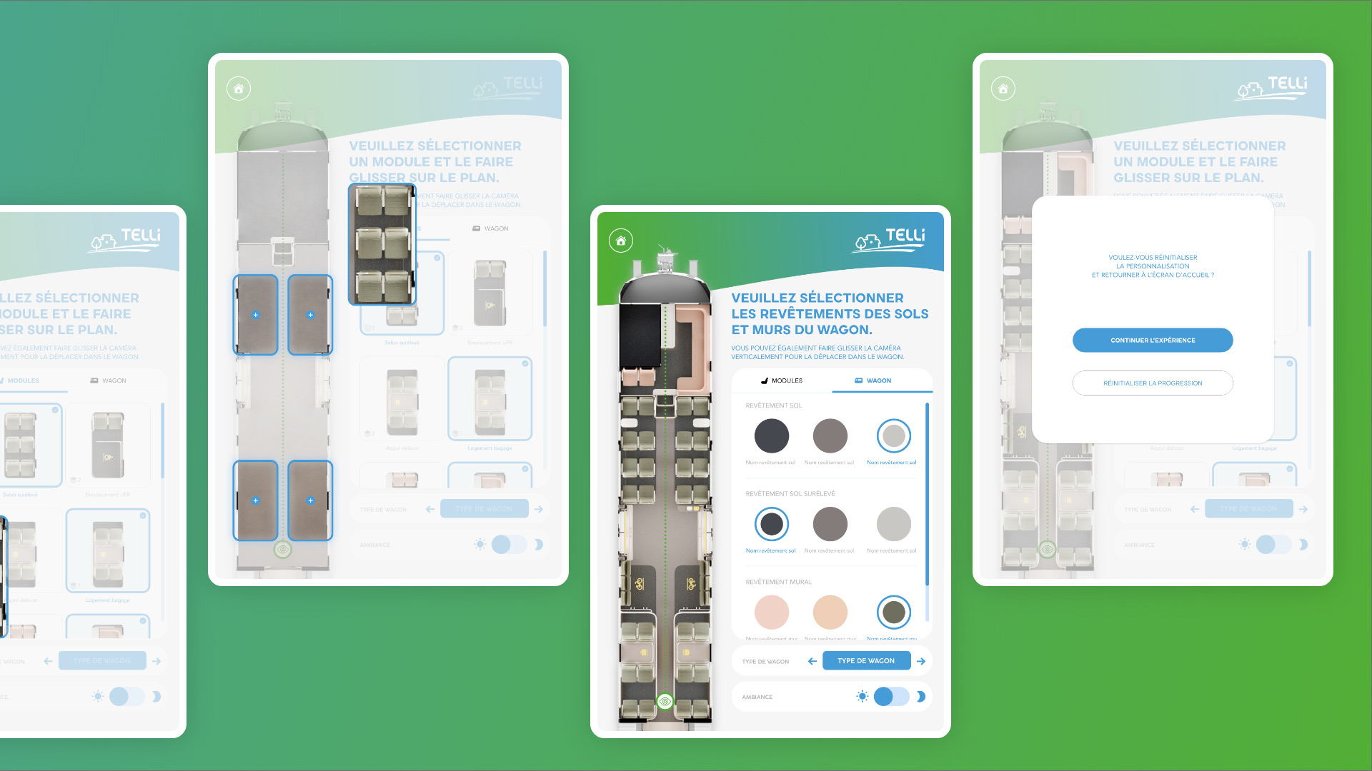 En partant de la modélisation fidèle de l’intérieur d’un wagon, des modules ont été créés contenant sièges, banquettes et espaces divers. Par la suite, ceux-ci ont été regroupés dans une application permettant de personnaliser leur couleur ou texture, ainsi que leur emplacement sur un plan interactif.
