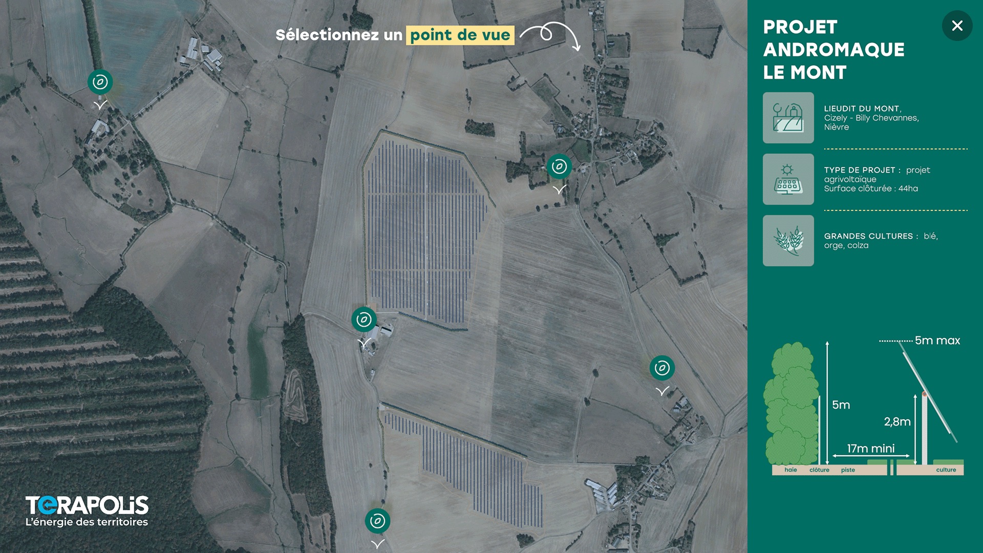 Comment le relief de nos communes peut-il être impacté par l’implantation d’un site de production éolien ou solaire ? Terapolis nous a confié la conception d’un logiciel de simulation virtuelle où l’utilisateur peut visualiser ces futures implantations en 360° sur un paysage basé sur de vraies données cartographiques.