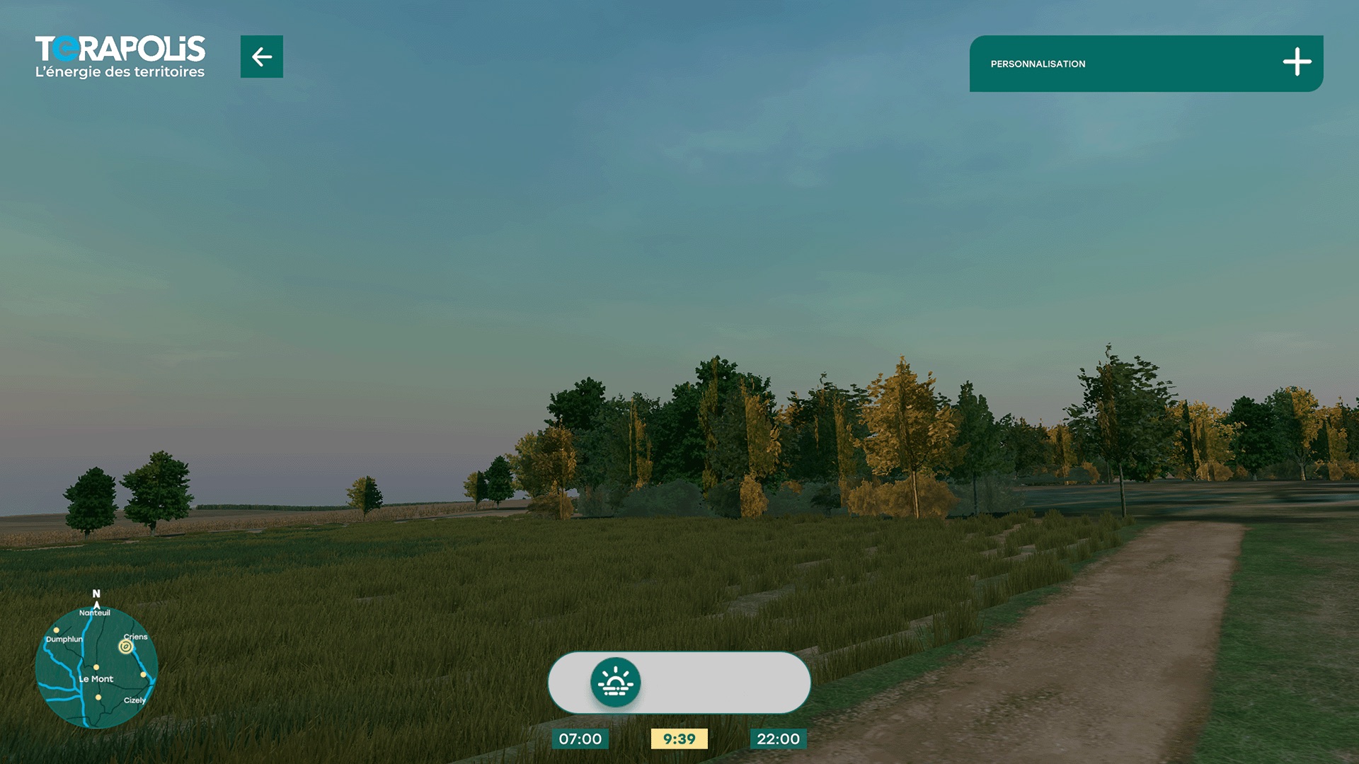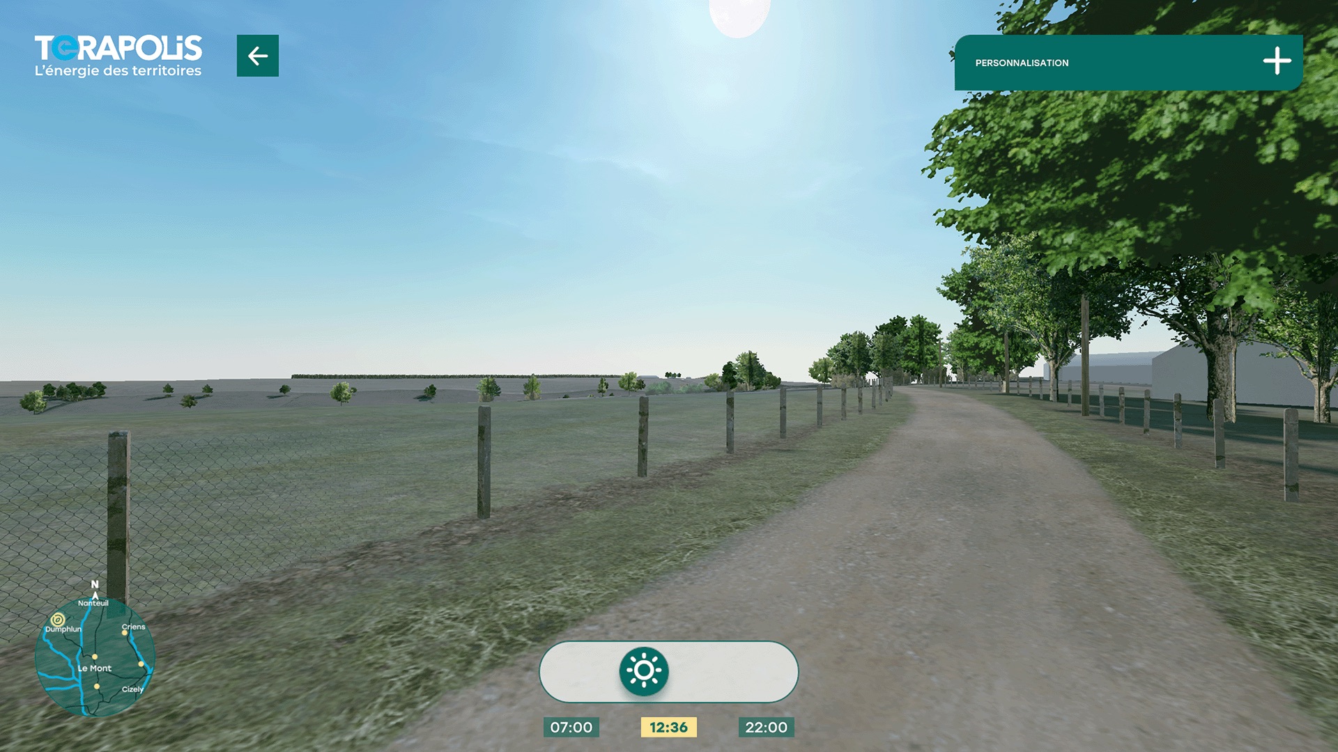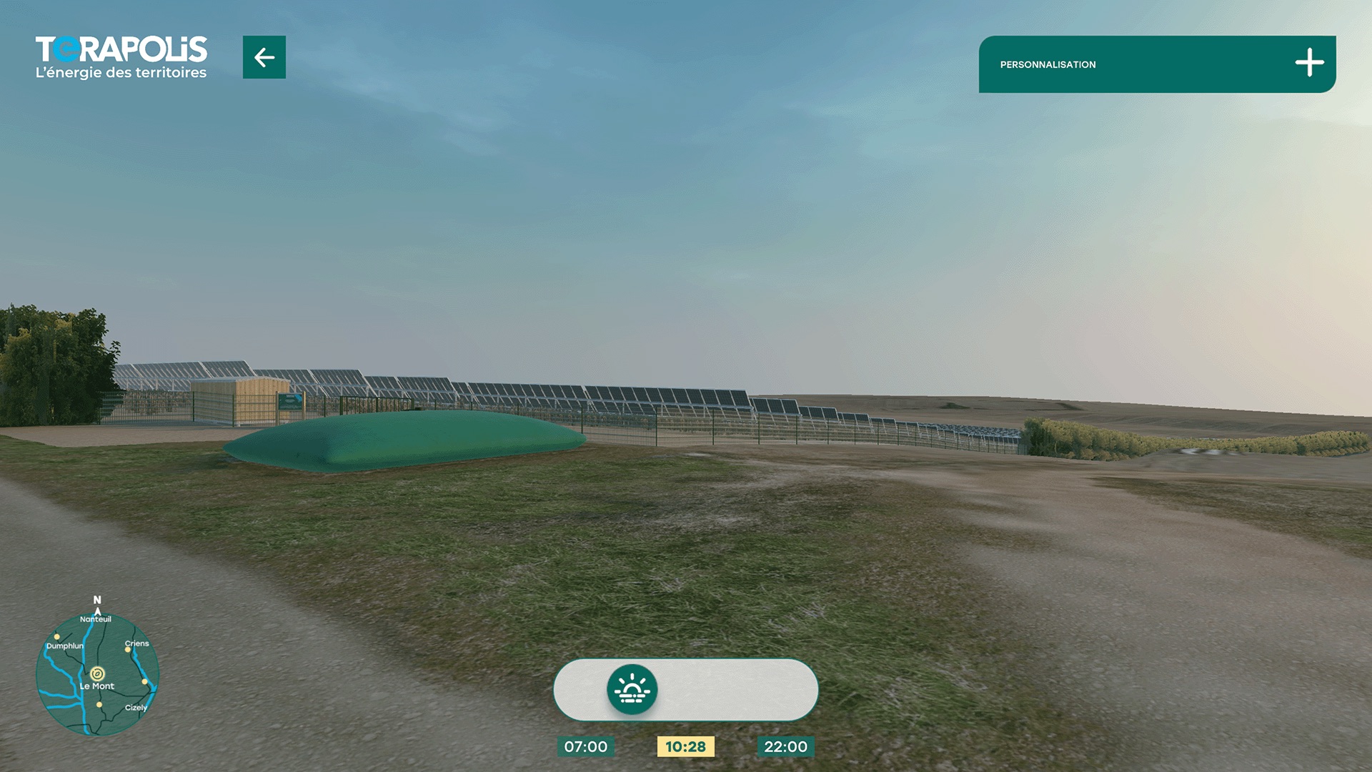 L’utilisateur peut personnaliser l’environnement en visionnant sur différents points de vue l’avant et après implantation, à différents moments de la journée et sous différentes conditions météorologiques.